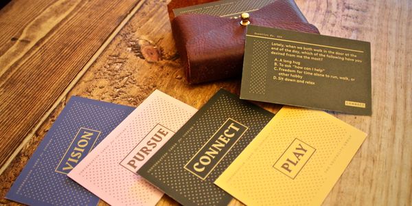 Casually brought on a date and placed on the table, the craftsman leather pouch, tactilely thick cards, and thoughtfully worded questions invite you and your partner into a playfully engaged conversation that deepens your connection.